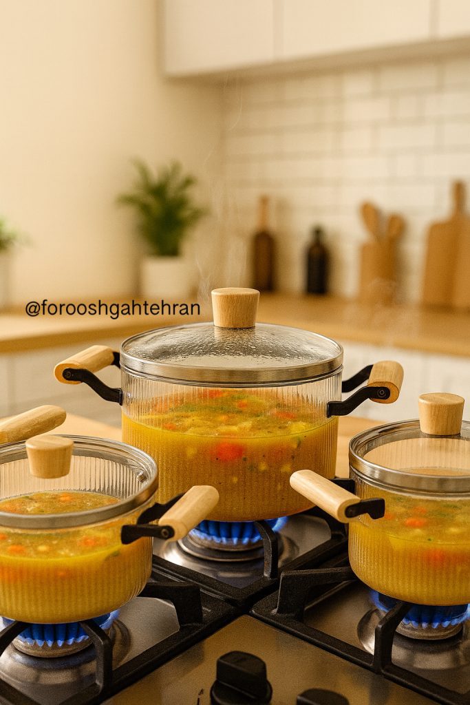 - نکته طلایی: قوریهای پیرکس با دستههای چوبی یا درب بامبو جلوهای طبیعی و زیبا دارند و برای استفاده روی شعله مستقیم مناسباند.