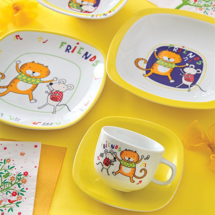 با انتخاب سرویس کودک دوستان، تک تک لحظات صرف غذا را برای فرزندتان به جشنی شادی بخش و سرگرم کننده تبدیل کنید. موش و گربه مهربان و با وفای این سرویس، همواره آماده اند تا سرگرم کننده ترین لحظات را برای فرزندتان رقم بزنند و او را در دنیایی از رنگهای شاد و انرژی بخش، دوستی های ابدی و جشنهای بیپایان، با خود همراه سازند. اکنون میتوانید با خیال راحت کنار فرزندتان بنشینید و از خیال پردازیهای شیرینش با این شخصیتهای دوست داشتنی و رضایتش از خوردن دستپخت پر مهرتان، درون ظروفی با کیفیت و دوستدار سلامتی، لذت ببرید.